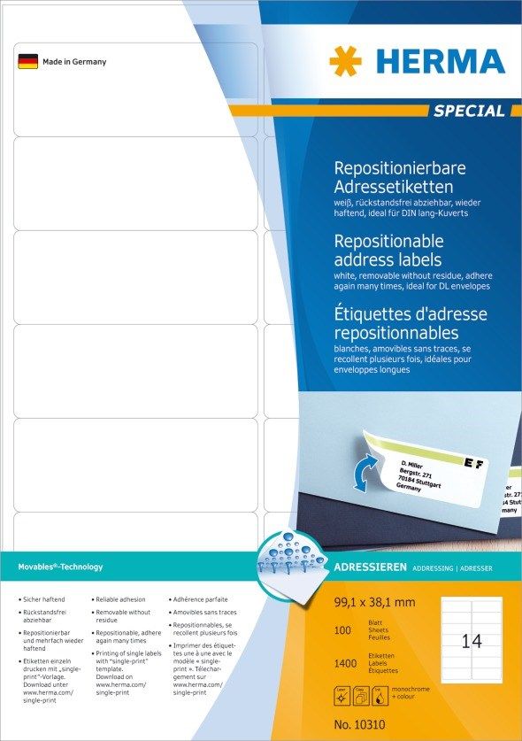 Itsekiinnittyvät etiketit A4-arkeille. Movables®-tekniikalla: luotettava tarttuvuus kaikkiin sileisiin, kuiviin, ehjiin ja pölyttömiin pintoihin, poistaminen jäännöksistä vahingoittamatta pintaa, ongelmaton uudelleensijoittaminen, kiinnitä uudelleen useita kertoja. Ihanteellinen lyhytaikaiseen merkintään ja pinnoille, jotka on suojattava vaurioilta. Erinomaiset tulostustulokset kaikilla lasertulostimilla, mustesuihkutulostimilla, kopiokoneilla, värilasertulostimilla ja värikopiokoneilla. Helppo käsittely monipuolisen suojareunan ja optimaalisen tasaisuuden ansiosta. Ympäristöystävällinen: FSC® Mix Credit -sertifioitu, klooriton valkaistu, liuottimeton liima. Tarrat ovat 100% kierrätettäviä, hävitettävä kuten jätepaperi, kierrätetystä pahvista tehdyt pakkaukset. Ilmaiset ohjelmistoratkaisut: www.herma.com/software.