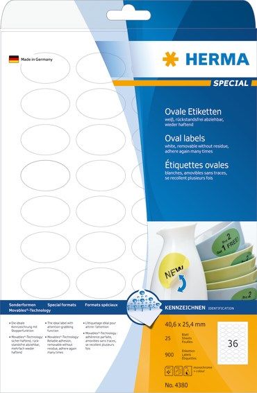 Herma tarra-arkki, ovaalin muotoinen tarra, 40,6mmx25,4mm, tarroja 900 kpl