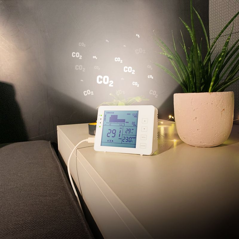 Sisäänrakennettu tiedonkeruulaite mahdollistaa tietojen tarkastelun CO2-pitoisuudesta, lämpötilasta ja kosteudesta viikon, päivän, tunnin, minuutin välein