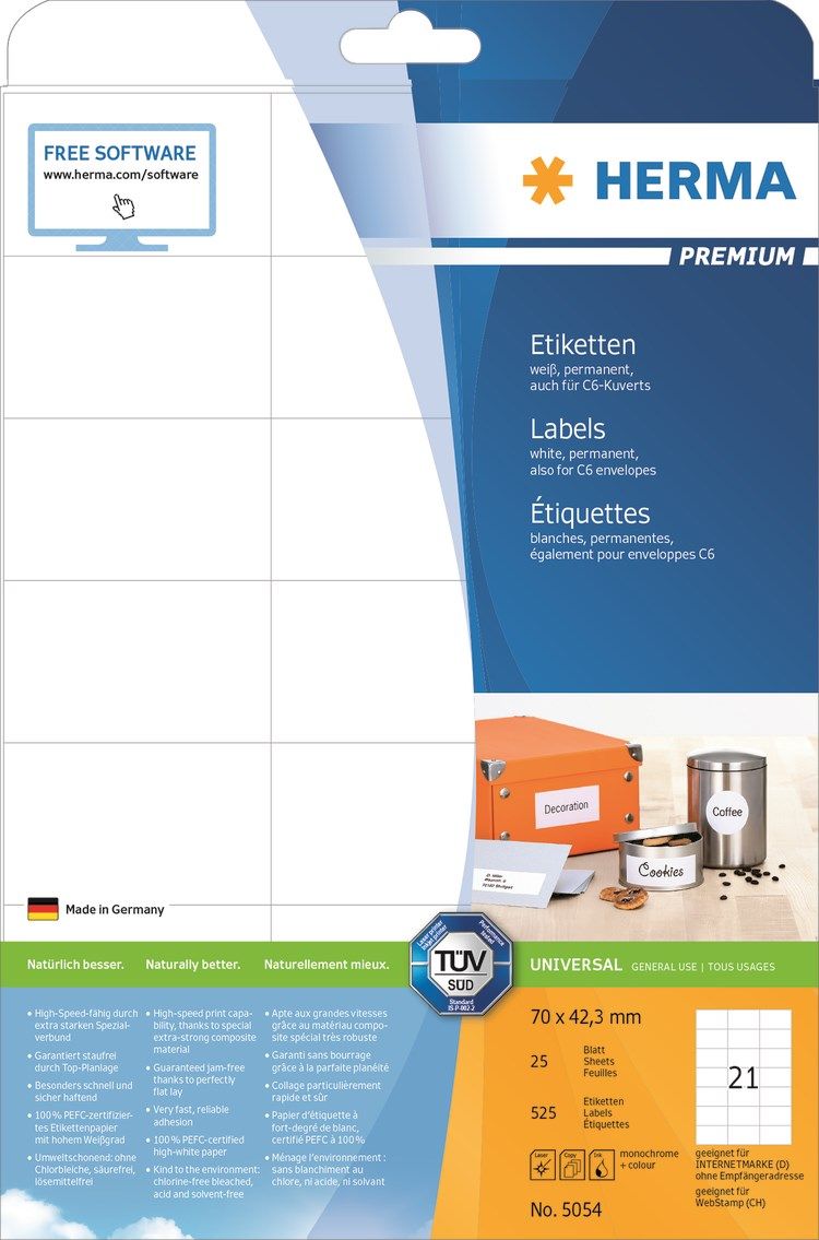 Itsekiinnittyvät tarrat A4-arkeille, pysyvä tarttuvuus. Täydellinen kaikille lasertulostimille ja mustesuihkutulostimille, kopiokoneille, värilasertulostimille ja värikopiokoneille. Nopea suorituskyky takaa erityisen tukevan erikoislaminaatin, täysin tasaisen levityksen ja suojaavan reunan. Häiriötön tulostus lasertulostimilla ja mustesuihkutulostimilla, TÜV SÜD: n testaama ja sertifioima. Korkea valkoisuus ja tasainen pinta takaavat täydellisen tulostuksen mustavalkoisena tai värillisenä. Selvästi paksumpi: erittäin vahvat tarrat - helppo kiinnittää. Erittäin nopea, luotettava tarttuvuus myös viileillä, kosteilla pinnoilla. Ympäristöystävällinen ja kestävä: klooriton valkaistu, PEFC-sertifioitu, liuottimeton liima. Tarrat ovat 100% kierrätettäviä, hävitettävä kuten jätepaperi, kierrätetystä pahvista tehdyt pakkaukset. Ilmaiset ohjelmistoratkaisut: www.herma.com/software.