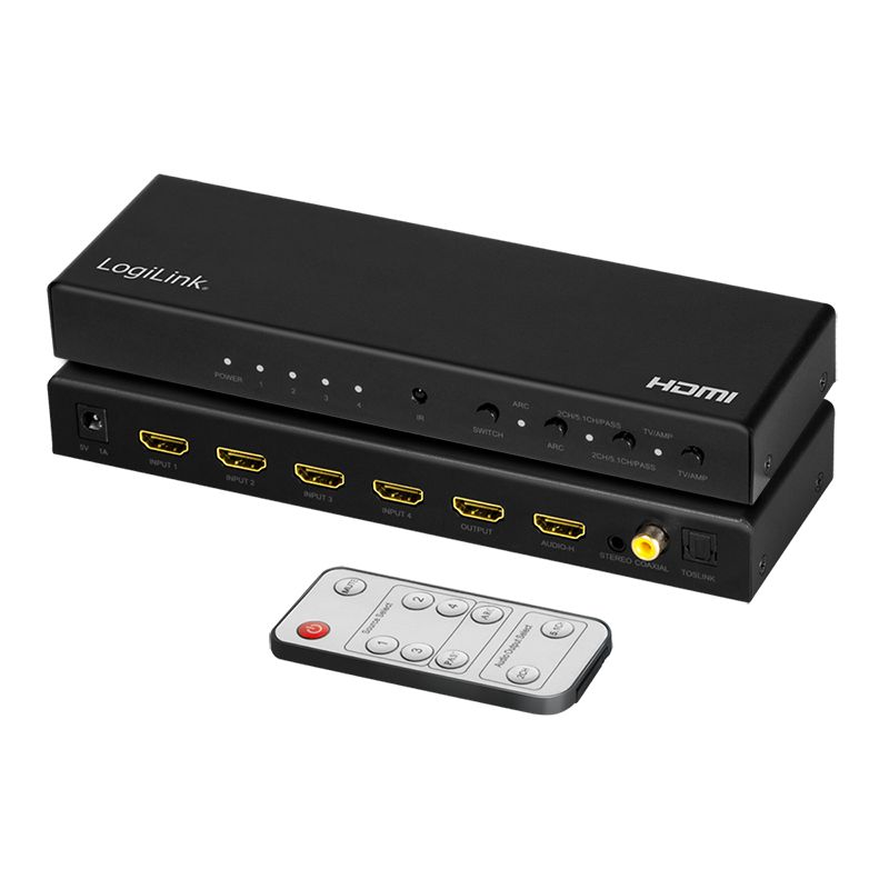 LogiLink 4K HDMI -kytkin mahdollistaa kätevän vaihtamisen neljän HDMI-tulolähteen välillä (videokamera, DVD/Blu-ray-soitin, pelikonsoli, suoratoistoboksi jne.) kaukosäätimellä, älykkäällä automaattisella tunnistuksella tai vaihtoehtoisesti kytkimellä. Ärsyttävä kaapelien kytkeminen ja irrottaminen on menneisyyttä. Ultra HD:n (4K/60 Hz) ansiosta voit kokea mediasisällön loistavalla tarkkuudella HDCP 2.2-, HDR-, CEC- ja 3D-tuen kanssa. Äänensiirto LPCM 7.1-, DTS-, Dolby Digital-, DTS-HD Master Audio- ja Dolby TrueHD-muodoissa sekä ulkoisen AV-vastaanottimen (ARC) liitäntä eivät myöskään jätä toivomisen varaa.