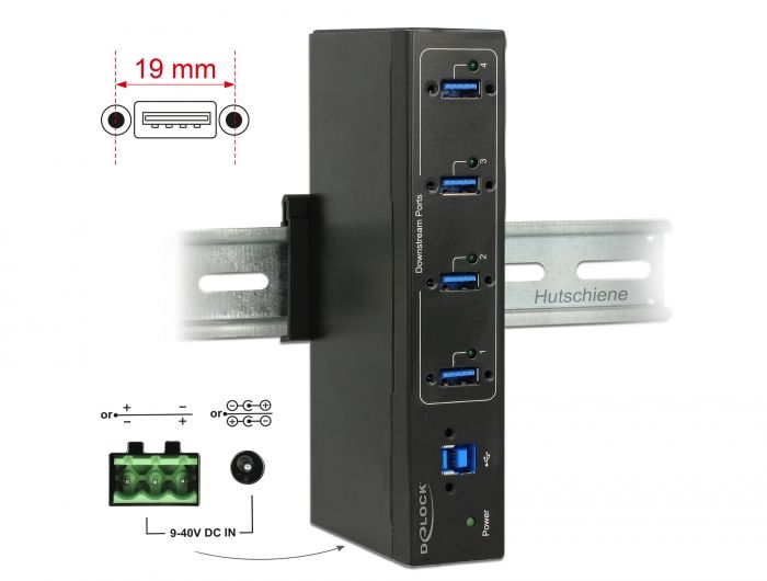 Tämä Delockin vankkarakenteinen ja teollisuuskäyttöön soveltuva USB-keskitin voidaan liittää tietokoneeseen USB Type-A -liitännän kautta. Se laajentaa tietokoneen kapasiteettia neljällä USB Type-A -liittimellä, jotka tukevat USB Battery Charging -spesifikaatiota BC1.2. Näin liitettyjä laitteita, kuten älypuhelimia, voidaan ladata nopeammin. Tarvittaessa pistorasiaan voidaan liittää valinnainen virtalähde tai virtajohto.