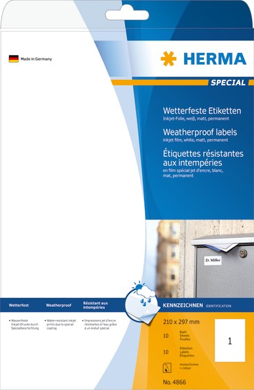Säänkestävät mustesuihkukalvotarrat A4-arkki, valkoinen/matta, itseliimautuva. Laadukas mustesuihkutulostukseen mustavalkoisena ja värillisenä. Kaupalliseen ja yksityiseen käyttöön: ulkona esillä olevien tavaroiden etiketit, esittelyikkunoiden kyltit, tiedotus- ja varoituskyltit. Taatusti vedenpitävät mustavalkotulosteet, käytä lightfast mustetta. Erikoispinnoite varmistaa musteen kiinnittymisen heti tulostuksen jälkeen. Reunus kaikilla puolilla: tulostettava koko alueelle, ihanteellinen mustesuihkutulostimille, joiden paperinohjaimet eivät ole yhtä luotettavia. Ilmaiset ohjelmistoratkaisut: www.herma.com/software.