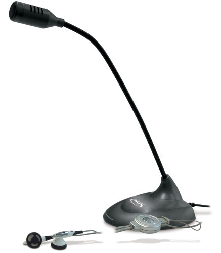 Paketti jossa tulee nappikuulokkeet sekä pöytämikrofoni.