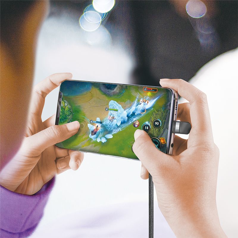 Kätevä 180° kulmassa oleva USB-C-pelikaapeli on ihanteellinen puhelimen tai kannettavan tietokoneen liittämiseen virtapankkiin tai USB-virtalähteeseen ilman, että kaapeli häiritsee pelinautintoa. Lataa laitettasi kätevästi ja mukavasti pelin aikana.