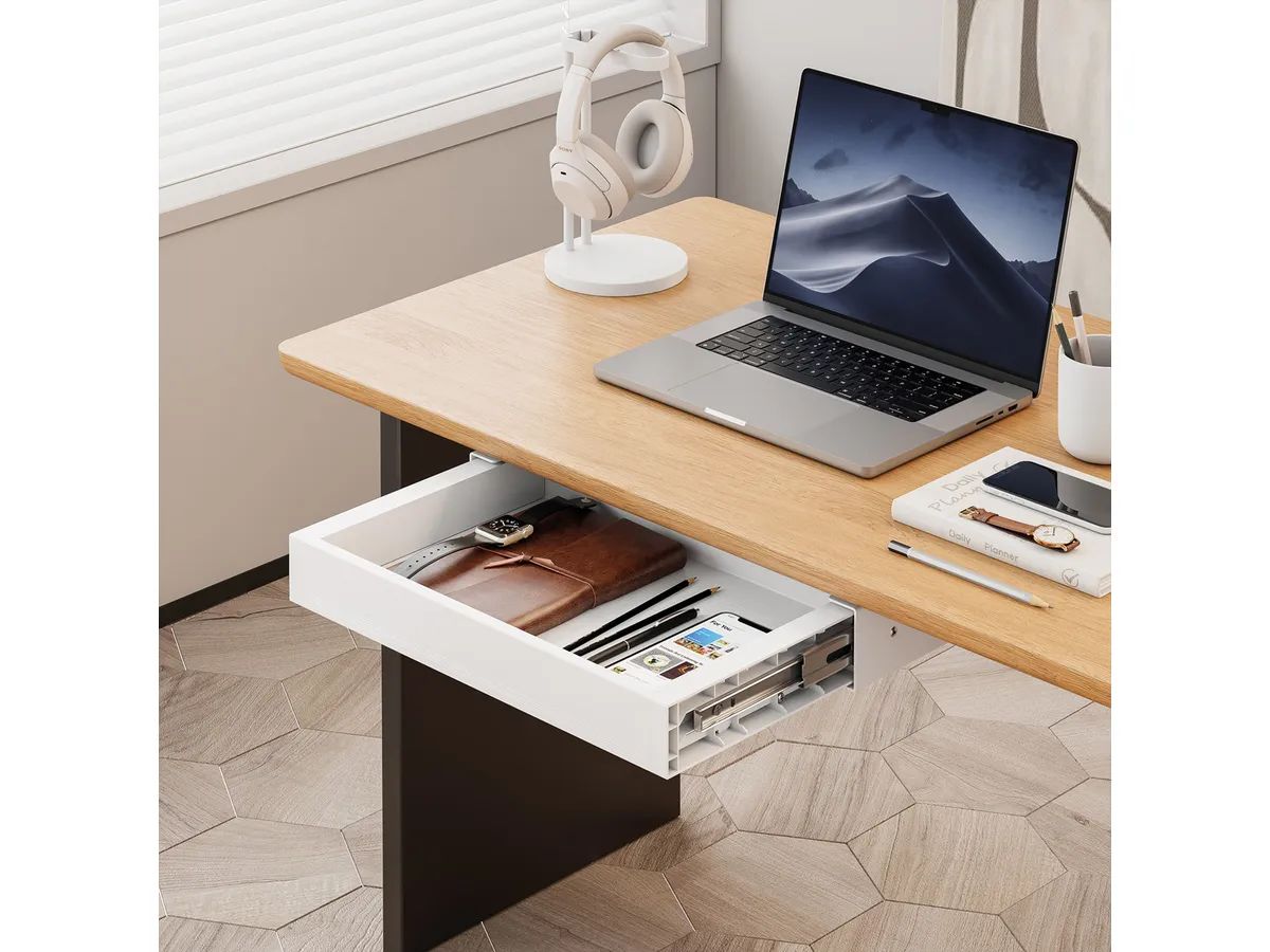 Tämän pöydän alle asennettavan säilytyslaatikon erittäin ohut muotoilu tarjoaa suuren säilytystilan, jossa muistiinpanot, puhelimet, kannettavat tietokoneet ja muut välineet pysyvät käden ulottuvilla vaikuttamatta jalkatilaan. Sulava laatikko avautuu ja sulkeutuu hiljaisesti ja helposti. Täydellinen järjestelmällinen lisävaruste mille tahansa työpöydälle!