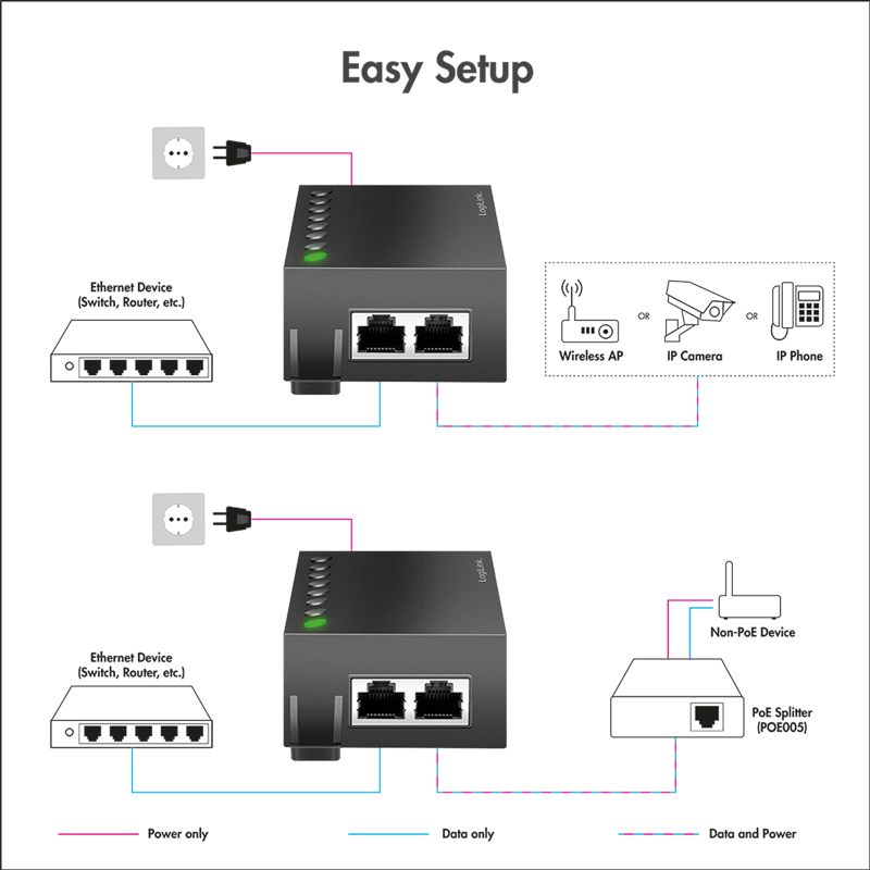 LogiLink PoE -injektori tarjoaa virtaa ja dataa yhteensopiville päätelaitteille yhden Cat5e/Cat6/Cat6/Cat6a-kaapelin kautta jopa 100 metrin päähän. LogiLink PoE -injektori sopii ihanteellisesti IP-kameroille, WLAN-tukiasemille tai IP-puhelimille, jotka on asennettava paikkoihin, joissa ei ole pistorasiaa.