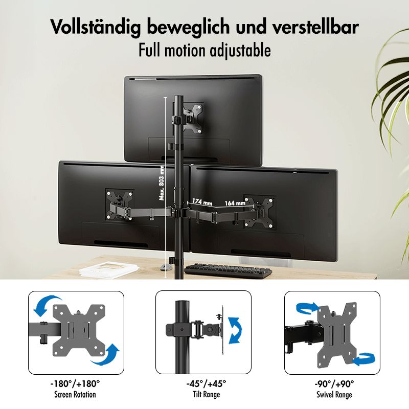 Kolmen näytön teline, 17–27", 10 kg vartta kohden, varren pituus: 376 mm/varsi