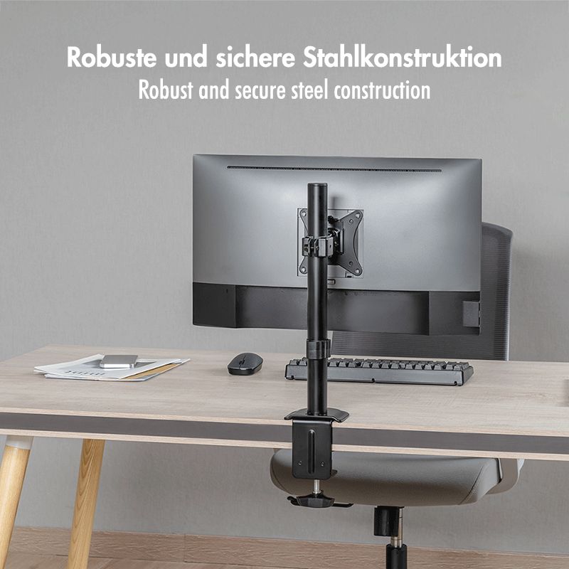 Elegantti ja tilaa säästävä kiinnitysjärjestelmä yhden näytön ergonomiseen sijoittamiseen työpaikalla. Teräs- ja muovirakenne mahdollistaa jopa 9 kg:n kuormituksen. Järjestelmä tarjoaa maksimaalisen joustavuuden 180°:n kiertokulman molempiin suuntiin, laajan kallistusalueen -45° - +45° ja kääntötoiminnon -90° - +90° ansiosta. Erityisominaisuus on irrotettava VESA-levy pikalukitustoiminnolla, mikä tekee näytön kiinnittämisestä erityisen helppoa. Kiinnitys voidaan kiinnittää joko pöytäkiinnikkeellä tai läpivientikiinnikkeellä.