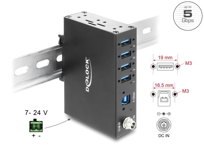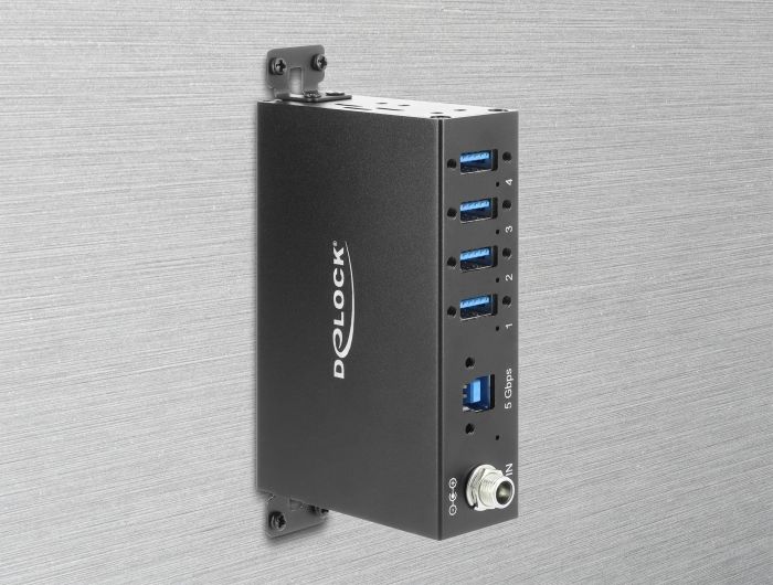 Delock Teollisuushub USB 5 Gbps Type-A x 4, 8 kV ESD-suojauksella ja DIN-kisko kiinnityksellä