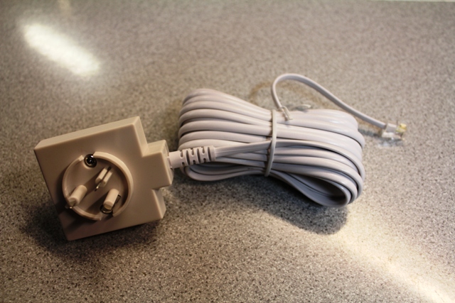 Puhelin- ja modeemikaapeli RJ11, 3-napainen seinäpistoke.