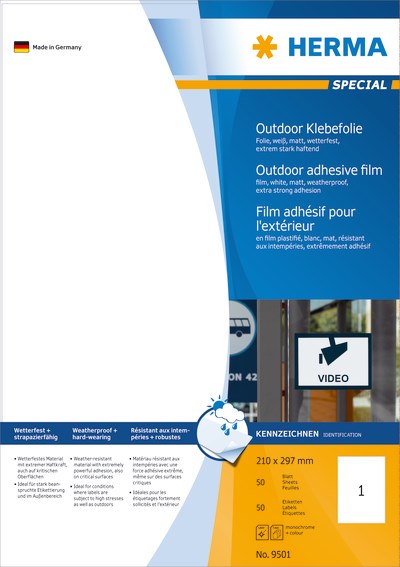 Säänkestävät itseliimautuvat etiketit valkoisesta, mattapolyetyleenikalvosta. Ihanteellinen ulkokäyttöön ja altistamiseen vaikeissa olosuhteissa: tunnistemerkinnät, näyttöikkunoiden tarramerkit, tiedotus- ja varoituskilvet, esineiden tunnistaminen varasto- ja tuotantolaitoksissa. Tehokas tarttuvuus, jopa kriittisillä pinnoilla. Säänkestävä, venyvä, vanhentamiskestävä, öljyä ja likaa hylkivä, kosteasti pyyhittävä, kestävä lämpötiloissa -40 ° C - + 150 ° C, suolavedenkestävä. Lasertulostimille, kopiokoneille, värilasertulostimille ja värikopiolaitteille. Ilmaiset ohjelmistoratkaisut: www.herma.com/software.