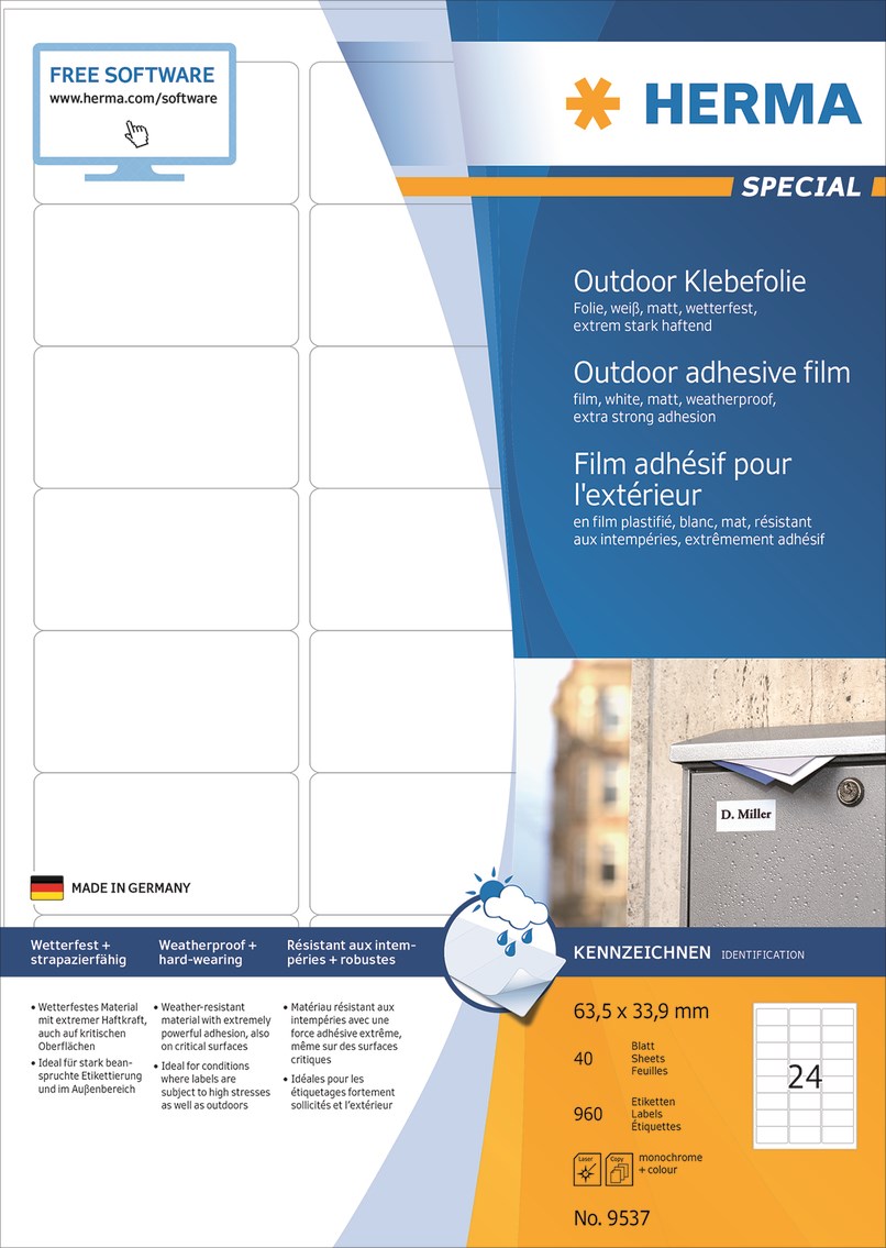Säänkestävät etiketit valkoisesta, mattapolyetyleenikalvosta, itseliimautuvat. Ihanteellinen ulkokäyttöön ja altistamiseen vaikeissa olosuhteissa: tunnistemerkinnät, näyttöikkunoiden tarramerkit, tiedotus- ja varoituskilvet, esineiden tunnistaminen varasto- ja tuotantolaitoksissa. Tehokas tarttuvuus, jopa kriittisillä pinnoilla. Säänkestävä, venyvä, vanhentamiskestävä, öljyä ja likaa hylkivä, kosteasti pyyhittävä, kestävä lämpötiloissa -40 ° C - + 150 ° C, suolavedenkestävä. Lasertulostimille, kopiokoneille, värilasertulostimille ja värikopiolaitteille. Ilmaiset ohjelmistoratkaisut: www.herma.com/software.